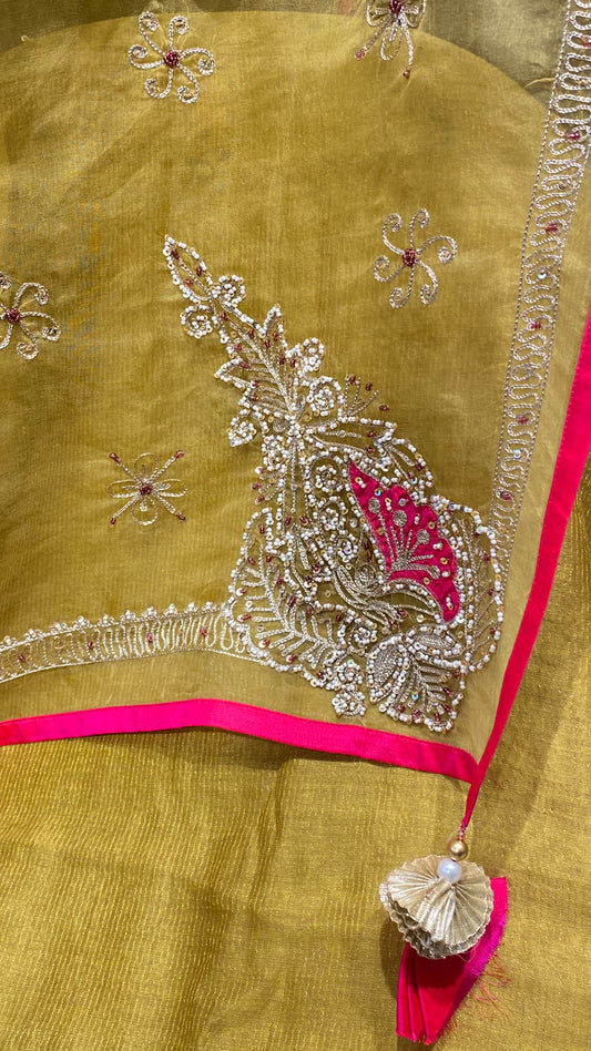 Lemon yellow chanderi shirt with contrast dupatta