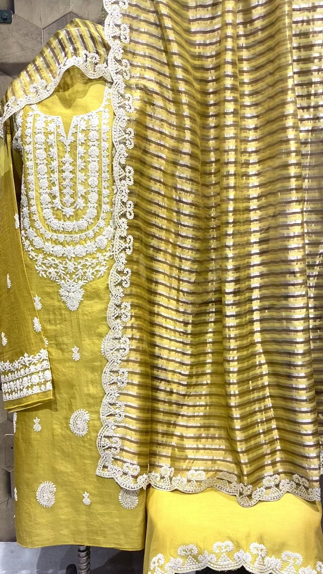 - Elegant Dori embroidery on bright mehandi Chanderi shirt embellished with matching pure organza dupatta finished with beautiful border on all four sides.