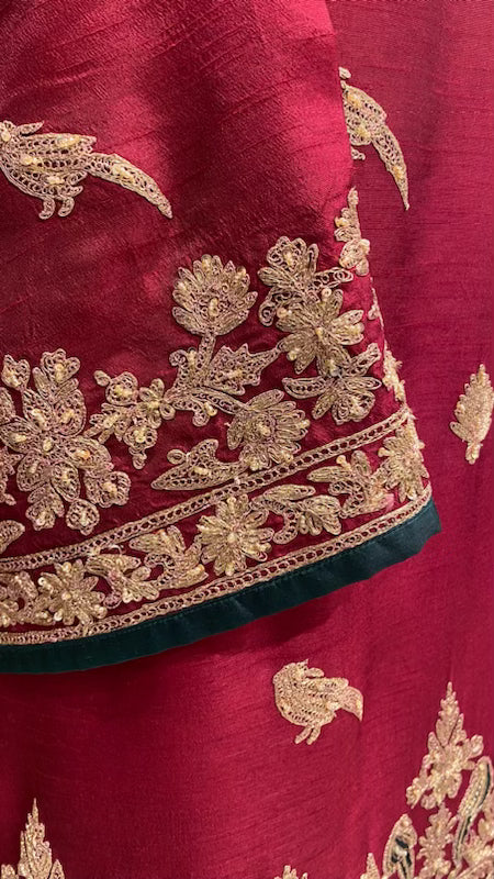 - Gold zari embroidery on vegan silk shirt embellished with sequins and pearls teamed with contrast colour tissue dupatta finished with beautiful zari border on all four sides and little motifs in the centre.The Pallas have been made heavy with patch work and embroidery.
