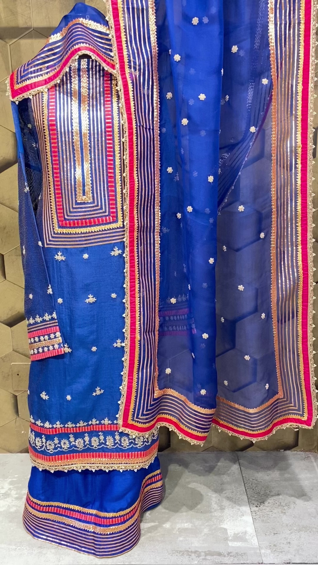 - Fine chanderi zari shirt with a very different neckline created from silk and gotta lines embellished with fine embroidery teamed with pure organza dupatta finished with silk and gotta borders