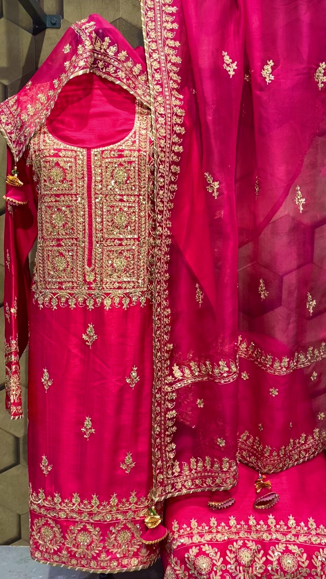 - Gold zari embroidery on vegan silk shirt embellished with sequins and pearls teamed with soft organza dupatta finished with beautiful embroidery on all four sides with little motifs in the centre finished with silk gota taping