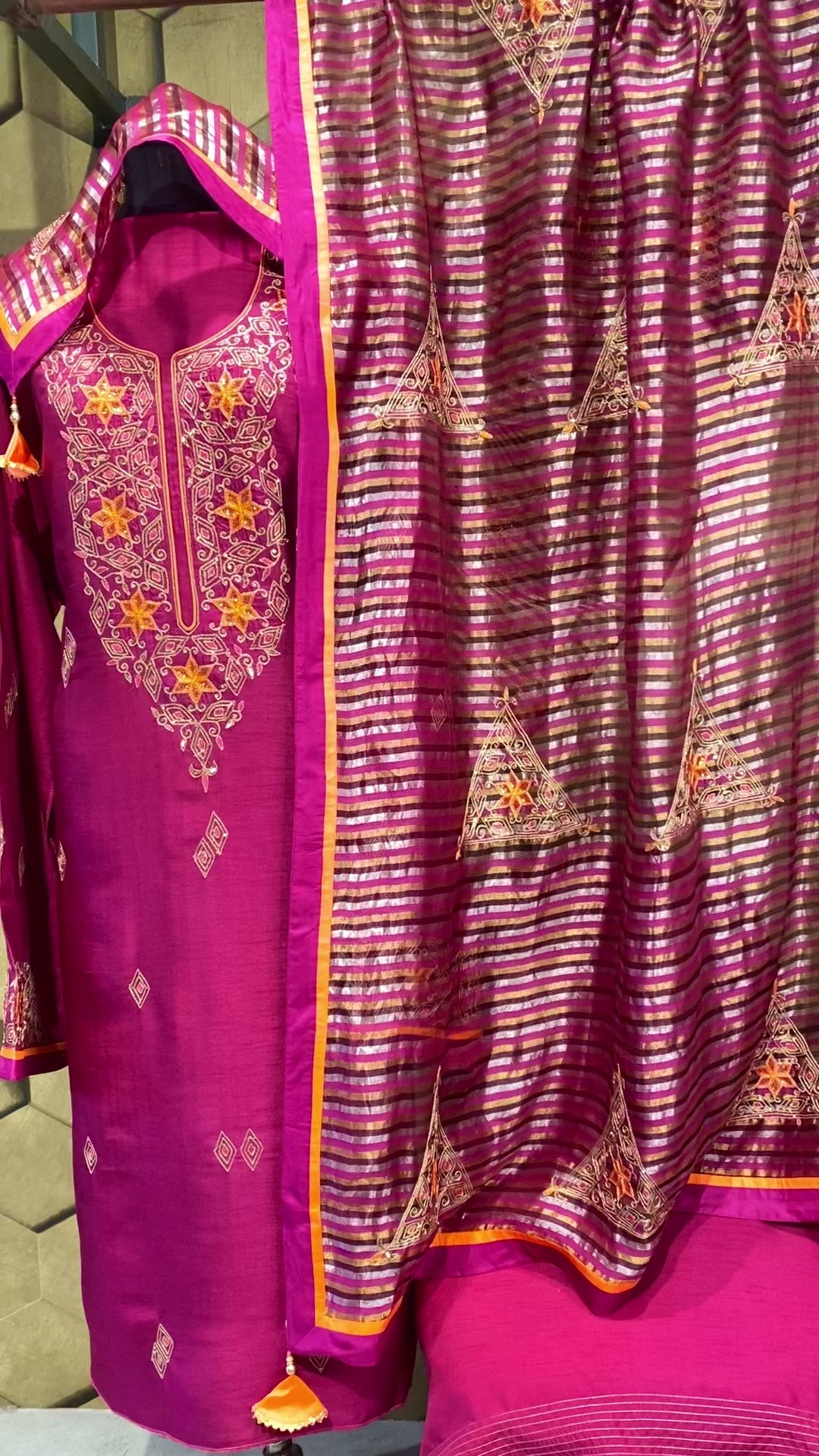 - Elegant and soft vegan silk shirt embellished with fine sequins and zari embroidery teamed with soft Tissue zari lines Dupatta beautified with heavy embroidery and finished with silk edging