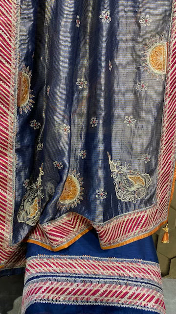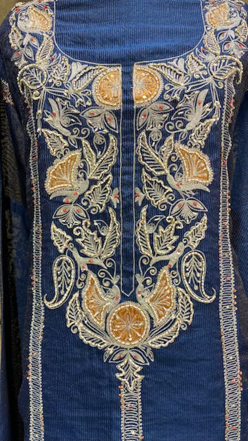 - Fine chanderi zari shirt with a very different neckline created from silk embellished with fine embroidery in zari sequins and beads teamed with soft tissue dupatta with gold zari finished with silk and gotta borders