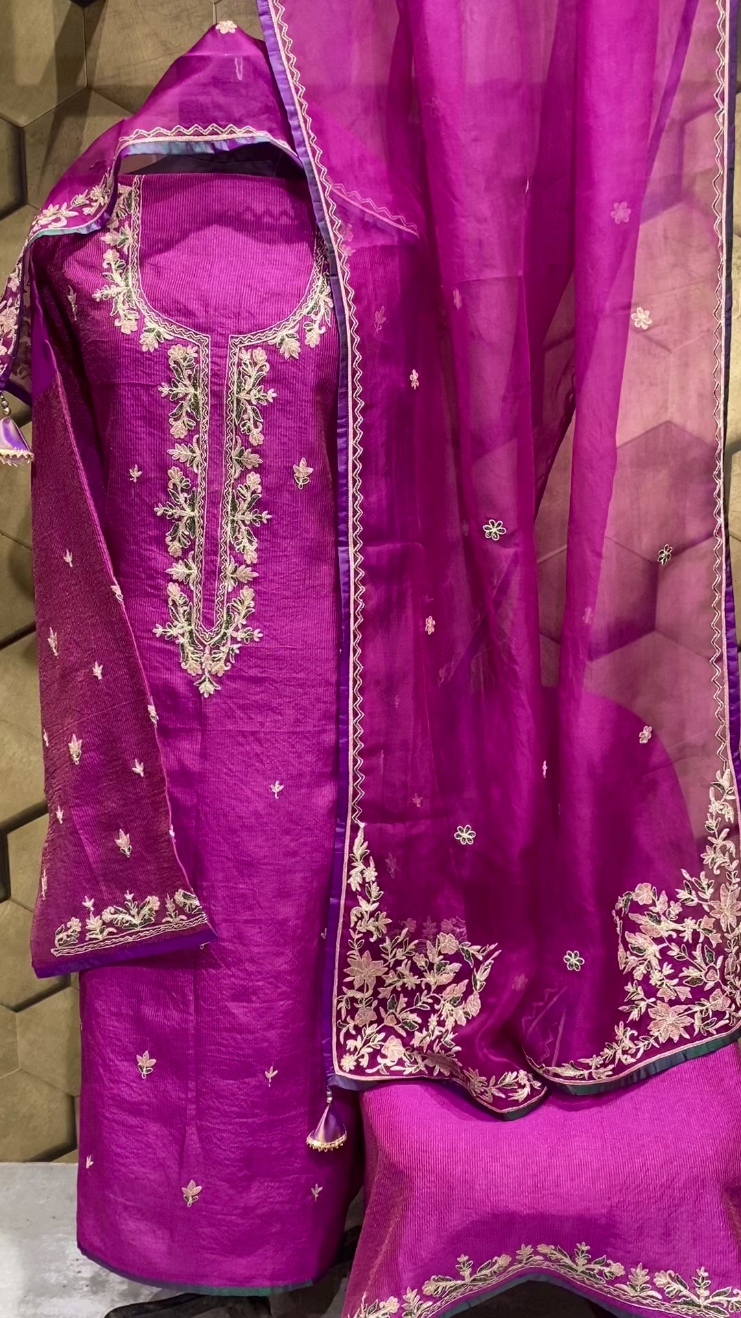 - Elegant and subtle soft chanderi with zari lines shirt embellished with embroidery in Dori teamed with heavily embroidered pure organza dupatta