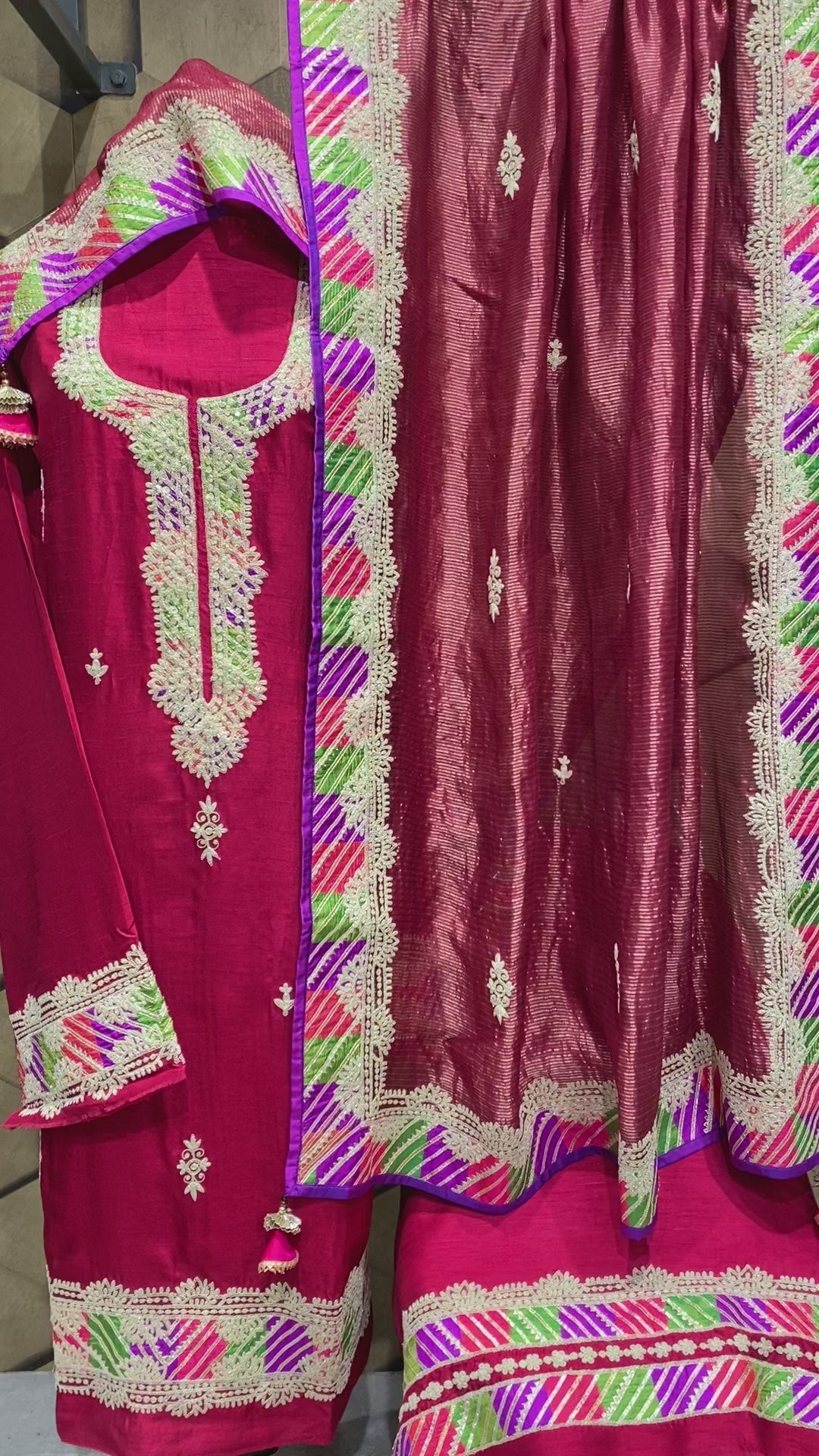 - Vegan silk shirt with a very different neckline created from silk and gotta lines embellished with fine embroidery teamed with soft tissue dupatta with gold and silver zari finished with silk and gotta borders