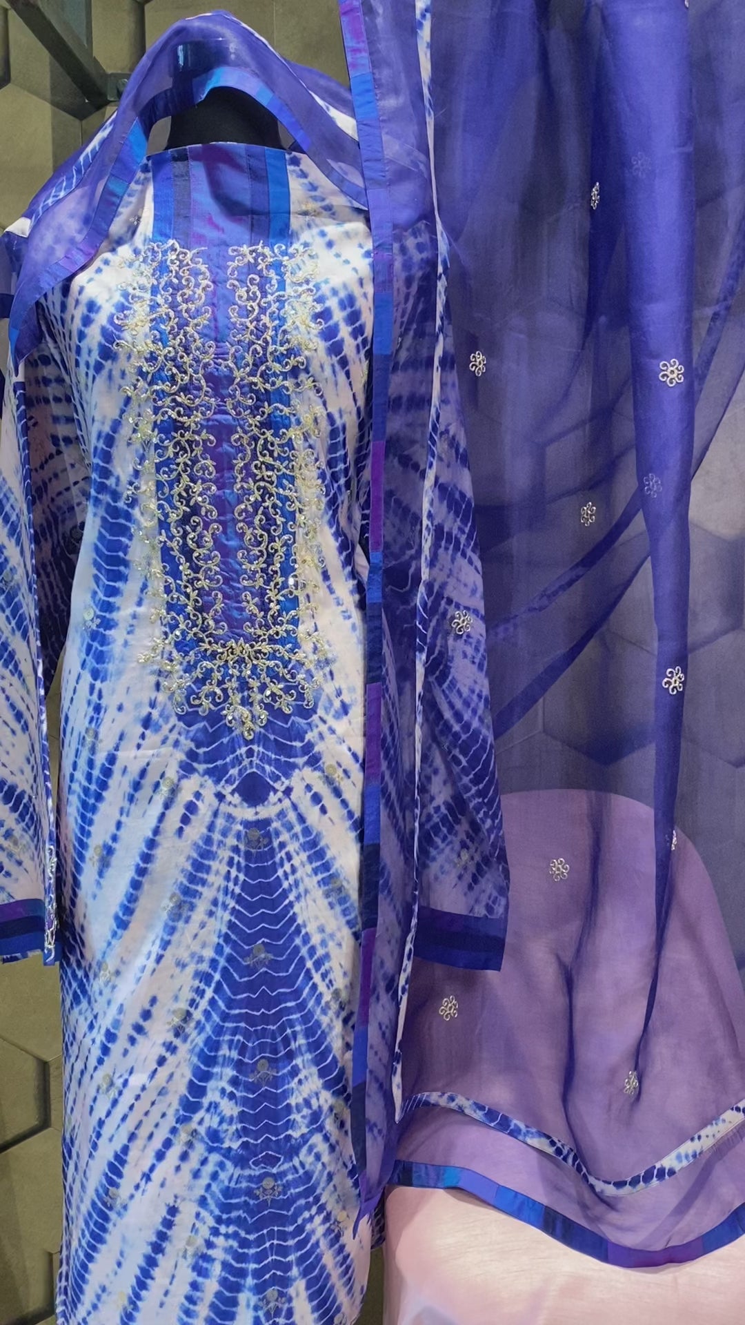 - Pure silk shirt with a very different neckline created from silk and embellished with fine embroidery in zari pearls and sequins teamed with pure organza dupatta finished with silk borders